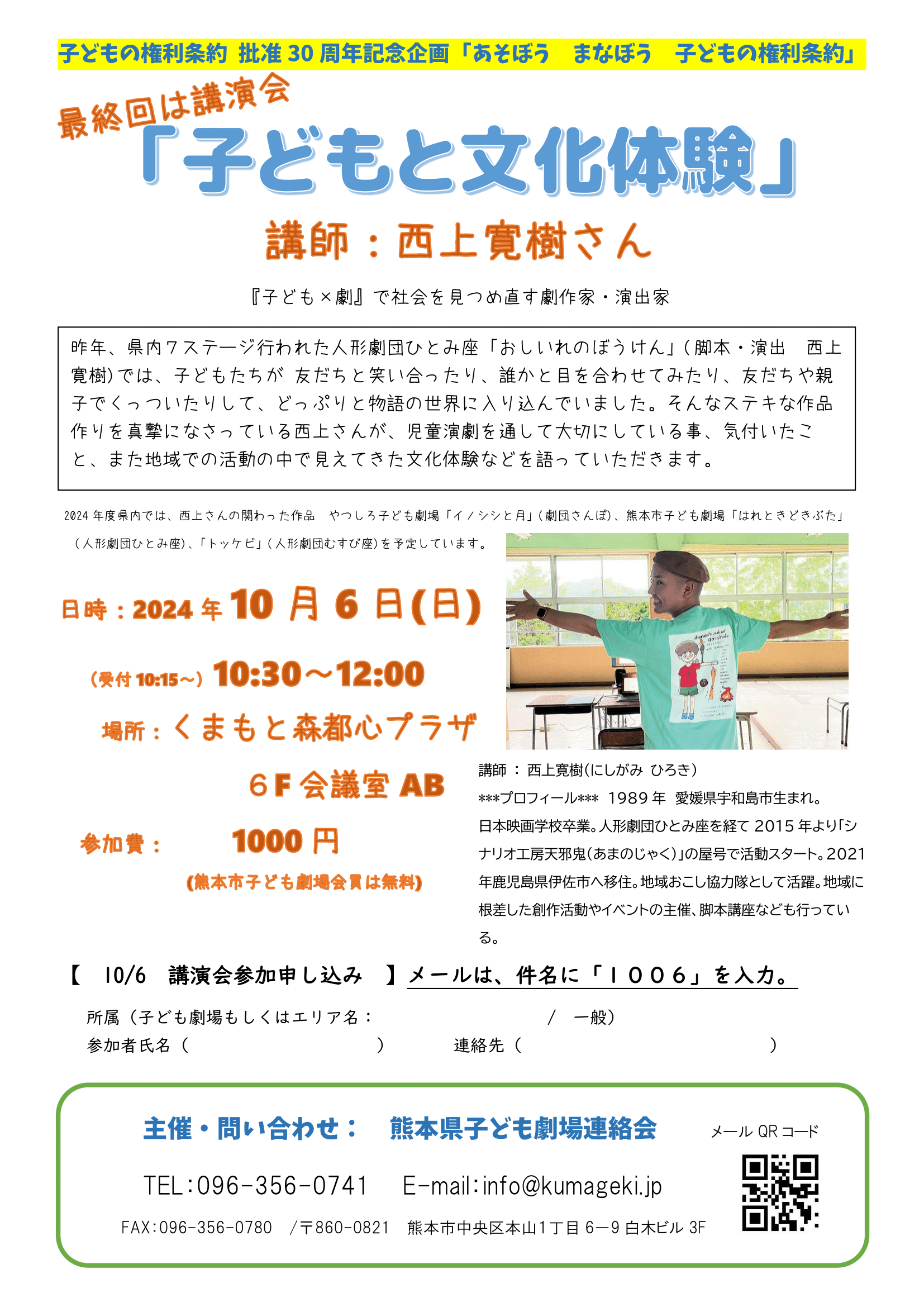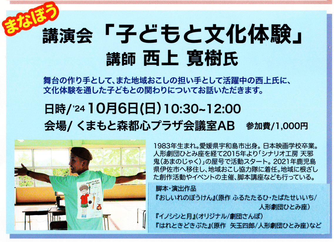 「子どもと文化体験」と題し、舞台の作り手として、また地域おこしの担い手として活躍中の西上寛樹氏に、文化体験を通した子どもとの関わりについてお話しいただきます。